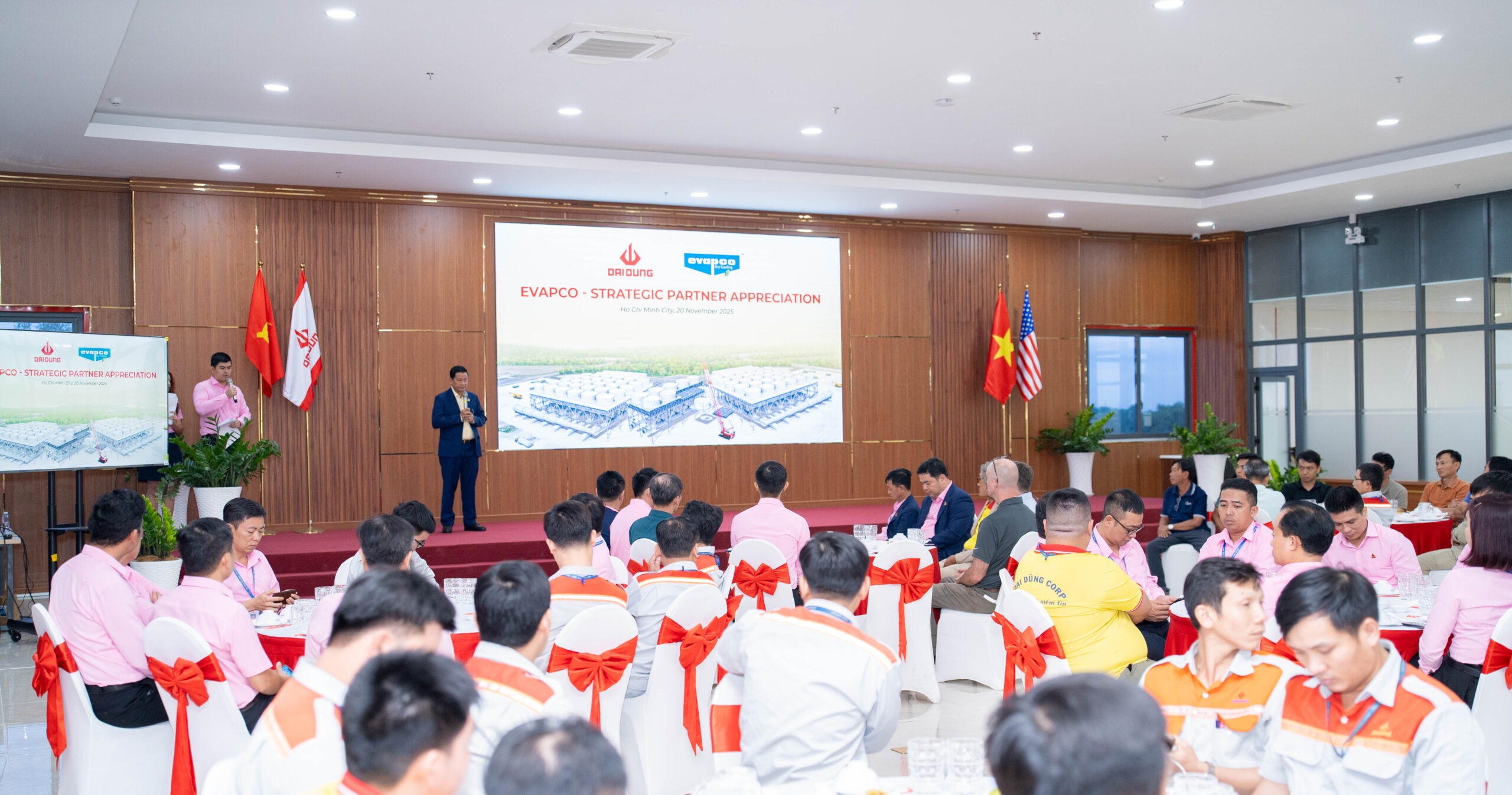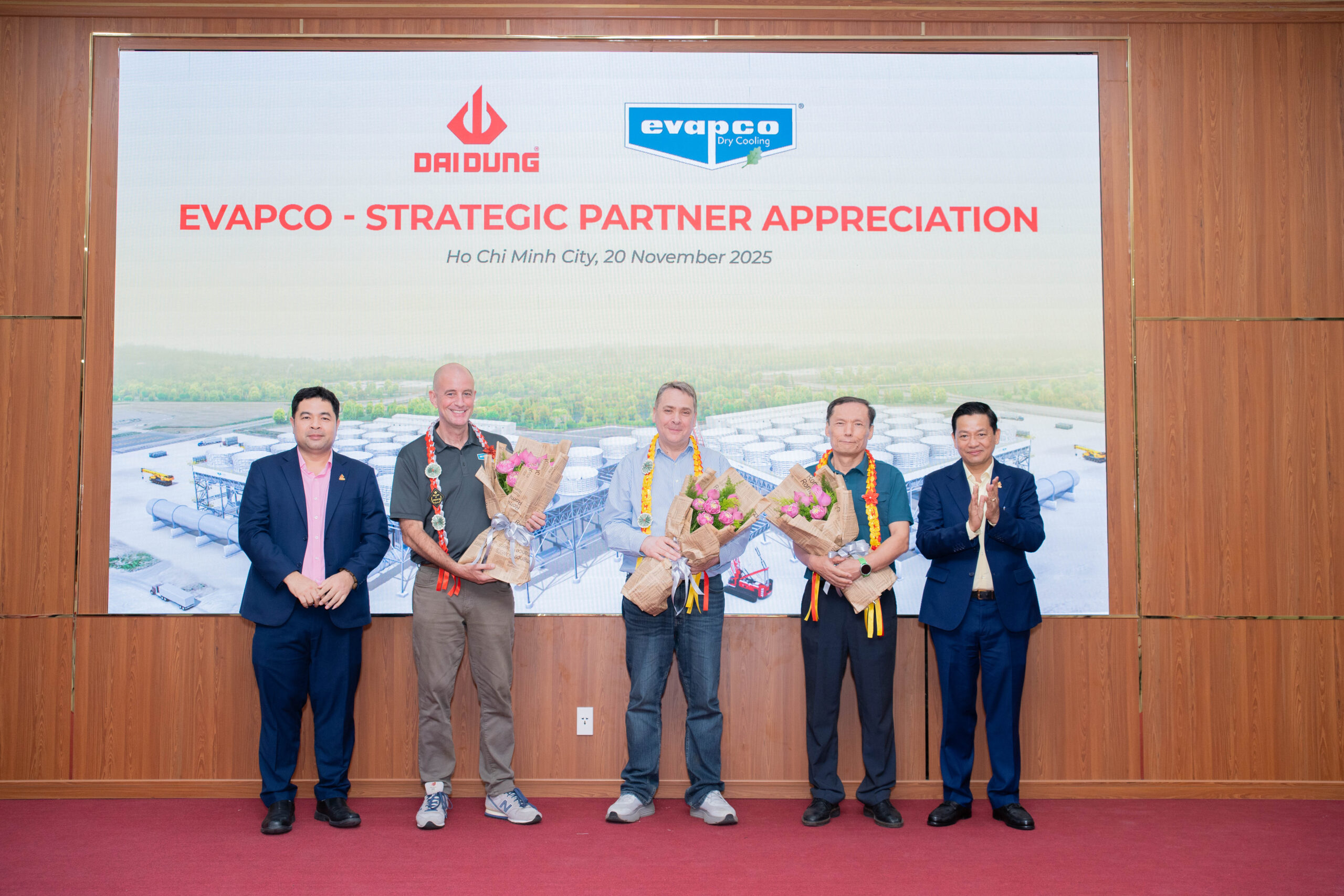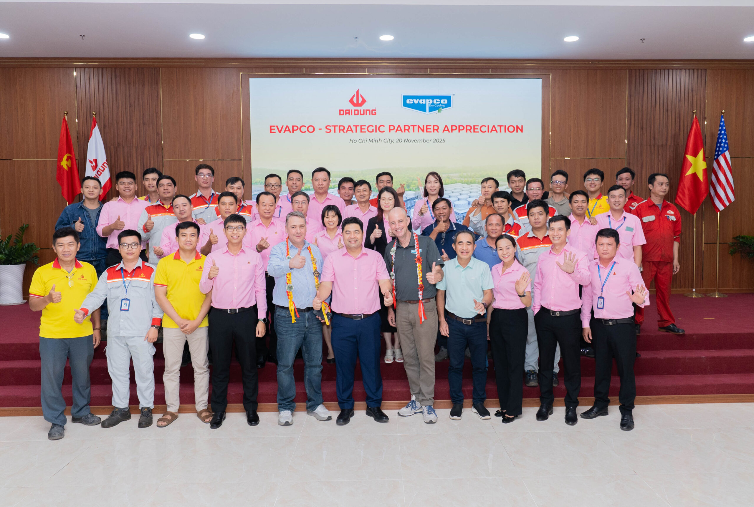 Tập đoàn Đại Dũng vừa long trọng tổ chức Lễ tri ân đối tác chiến lược EVAPCO, ghi nhận 6 năm đồng hành trong lĩnh vực cơ khí chế tạo và kết cấu thép phục vụ các dự án nhiệt điện và trung tâm dữ liệu lớn. Sự kiện có sự tham dự của ông Trịnh Tiến Dũng, Chủ tịch HĐQT kiêm Tổng Giám đốc Tập đoàn Đại Dũng, cùng các đại diện cấp cao từ EVAPCO Dry Cooling, Inc.