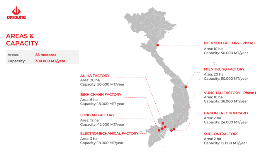 Impressive Factory Scale and Capacity: Currently, DDC Group owns 06 strategic manufacturing clusters located in logistically favorable locations (An Ha, Long An, Binh Chanh, Central Region, Ba Son, Nghi Son, Vung Tau) with a total area of up to 120 hectares. The current total design capacity reaches 500,000 tons of steel structures per year.