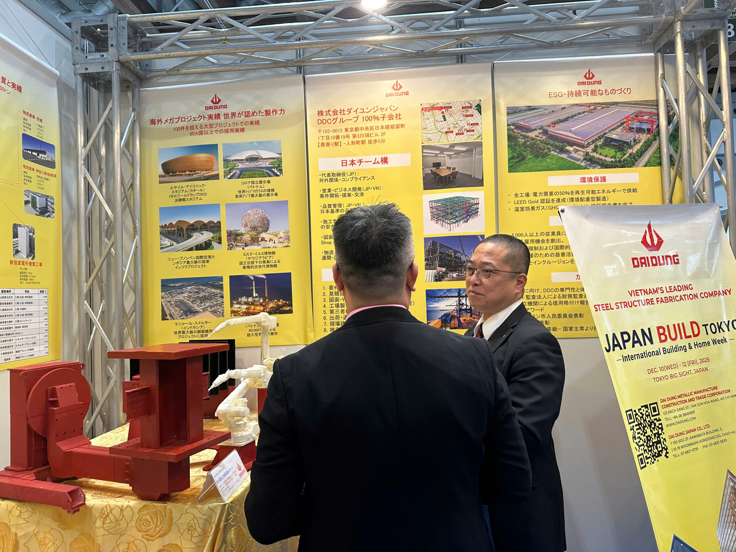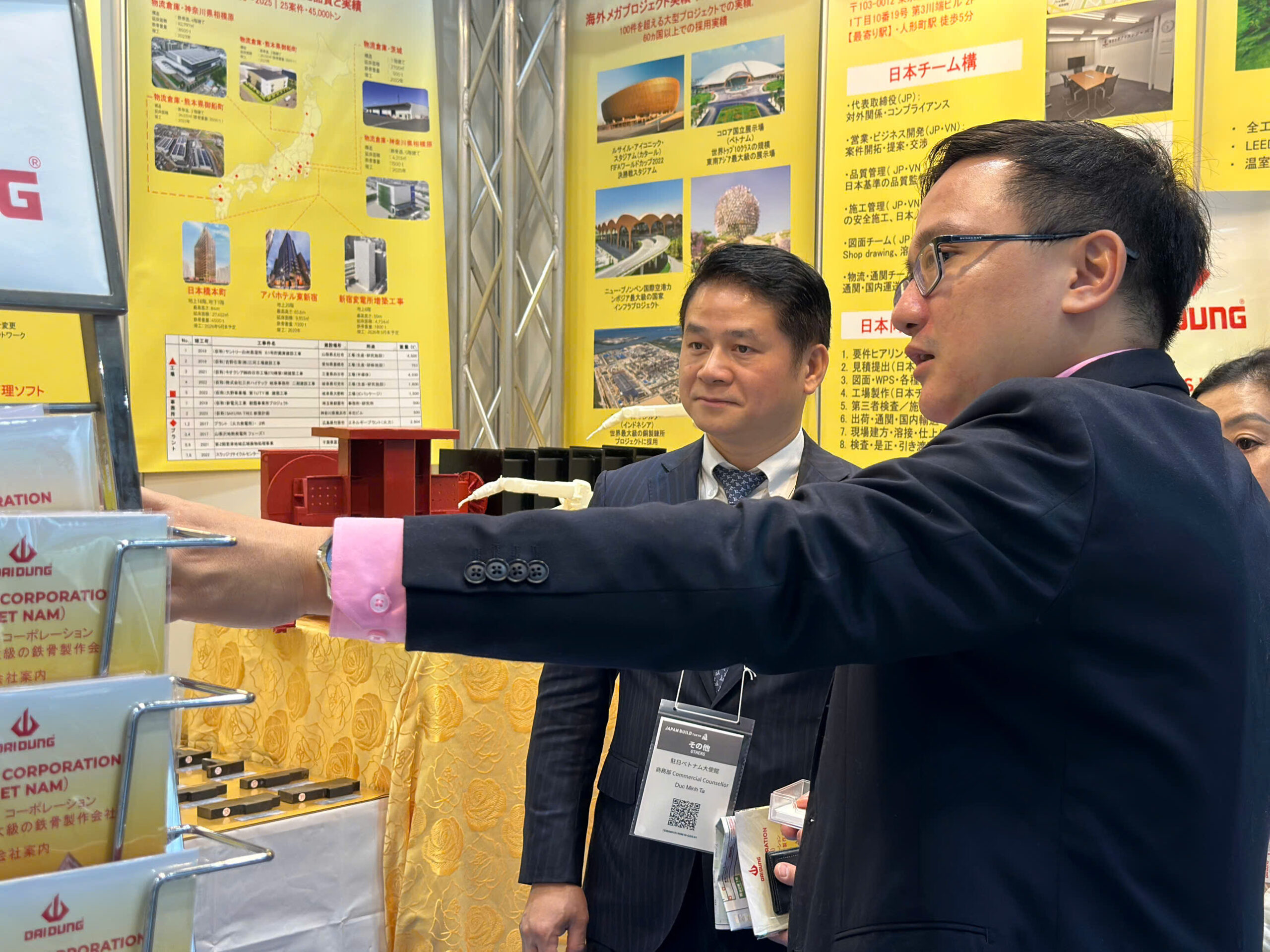 At its booth, DaiDung showcased scale models, products, and technical materials demonstrating its large-scale steel structure manufacturing capabilities in Vietnam. The company highlighted its compliance with international standards such as H Grade, EN 1090 EXC4, AISC, and ISO, along with comprehensive quality control processes supporting both manufacturing and export operations. According to DaiDung representatives, these factors are essential when entering the Japanese market, where JIS and JASS 6 standards are widely applied in industrial projects.