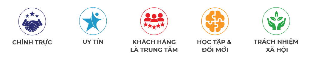 Giá trị cốt lõi: Chính trực – Uy tín – Khách hàng là trung tâm – Học tập & Đổi mới – Trách nhiệm xã hội và cộng đồng
