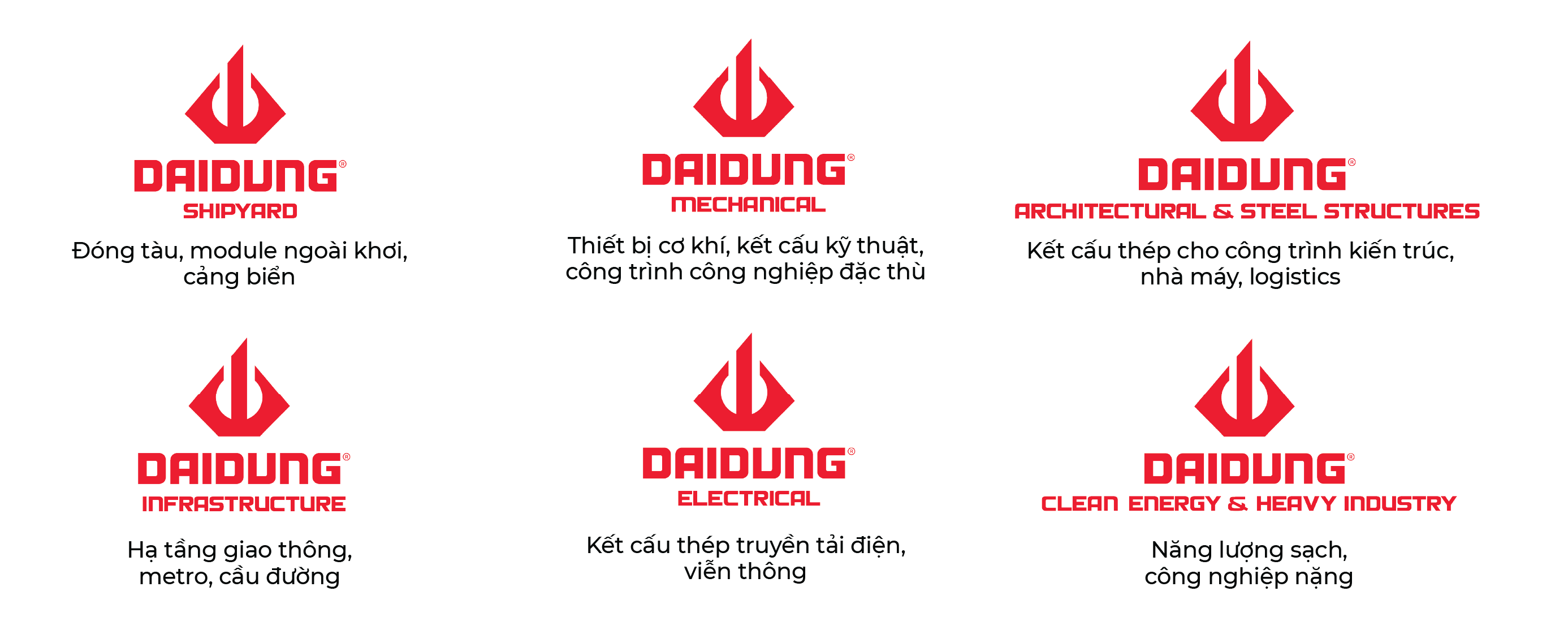 Trên nền tảng đó, Đại Dũng xây dựng cấu trúc thương hiệu tập đoàn thống nhất, chuyên sâu theo từng lĩnh vực, tạo nên một hệ sinh thái công nghiệp đủ năng lực tham gia trọn vẹn chuỗi giá trị các dự án lớn trong và ngoài nước. Bao gồm 06 thương hiệu:
